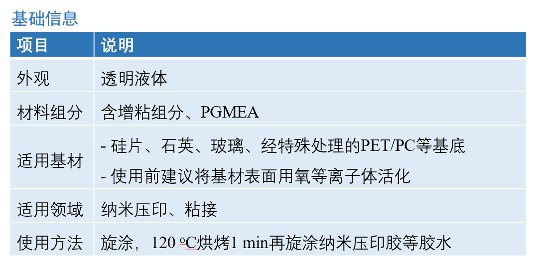 DT-T14 is an adhesion promoter developed for the nanoimprint lithography process. It can effectively enhance the adhesion of acrylate-based UV imprint adhesives to substrates such as silicon wafers, quartz, glass, and specially treated PET/PC, thereby improving the quality and yield of transferred products. It is easy to use, and after adhesion promotion, the cross-cut test result of the nanoimprint adhesive layer generally reaches 5B.